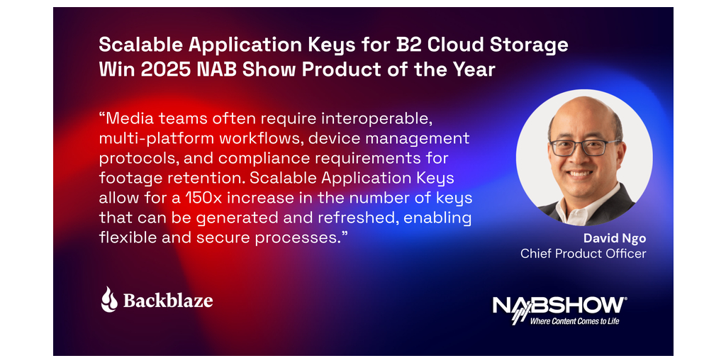 SAN MATEO, Calif.--(BUSINESS WIRE)--$blze #Cloud--Backblaze, Inc. (Nasdaq: BLZE), the cloud storage innovator providing a modern alternative to traditional cloud providers, today announced they were the recipient of the National Association of Broadcasters (NAB) Show 2025 Product of the Year Award in the Cloud Computing and Storage category for the Scalable Application Keys feature released for their Backblaze B2 Cloud Storage platform.