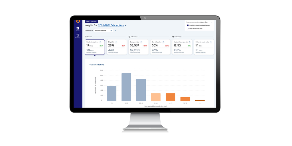 The new RouteWise AI dashboard gives district leadership insights into the metrics that matter, including student ride times, costs per rider, and bus utilization rates. Users can compare these metrics against national averages, allowing them to benchmark against peers and track improvements. HopSkipDrive's team of transportation and change management experts collaborate on the best transportation plan for each district that fit into existing routing software or platforms.