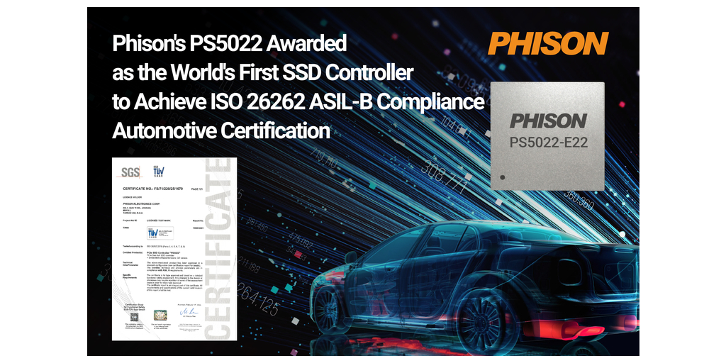 SAN JOSE, Calif.--(BUSINESS WIRE)--#Gen4--Phison Electronics (8299TT), a leading innovator in NAND controllers and storage solutions, announced today that its PCIe Gen4x4 PS5022 controller, designed for automotive applications, has become the world’s first SSD controller to receive ISO 26262 ASIL-B compliance certification. This automotive certification highlights Phison’s adherence to the functional safety (FuSa) standard in the NAND industry, underscoring Phison’s commitment and technological leadership in the automotive storage market.