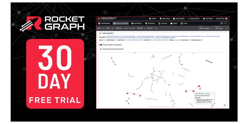 - Sample Dataset for Rapid Evaluation: The included AML dataset enables immediate use of Rocketgraph’s pattern detection and relationship mapping capabilities.