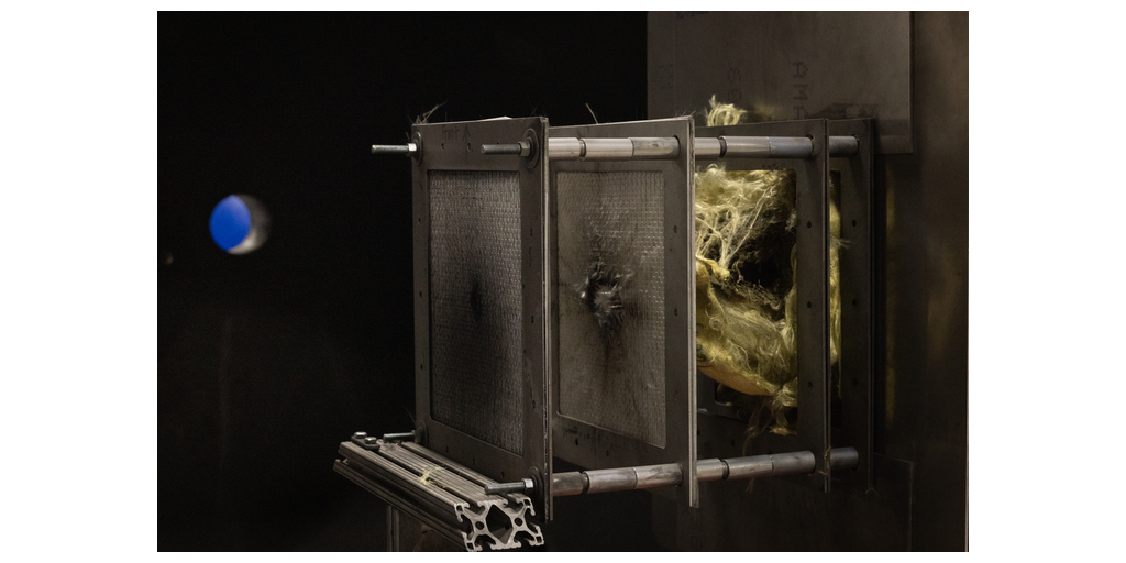 The impact trials were conducted in two phases. The first grouping of shots varied the softgoods materials while keeping gun parameters constant, simulating MMOD impacts to directly compare how each material performed. After identifying the most promising materials, the team adjusted gun parameters to develop an equation characterizing the efficacy and performance of the selected shield stack. During the tests, 40 experimental shots were fired toward the materials to confirm the configuration selection. Once the team had established a strong but mass-efficient shield configuration, 19 additional shots were discharged at the material. These efforts were critical to mitigate future risks posed by MMOD—tiny, high-speed particles that can cause significant damage to spacecraft and habitats in orbit.
