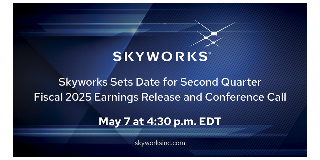 IRVINE, Calif.--(BUSINESS WIRE)--Skyworks Solutions, Inc. (Nasdaq: SWKS), an innovator of high-performance analog and mixed-signal semiconductors connecting people, places and things, will host a conference call with analysts to discuss its second quarter fiscal 2025 results and business outlook on May 7, 2025, at 4:30 p.m. EDT.