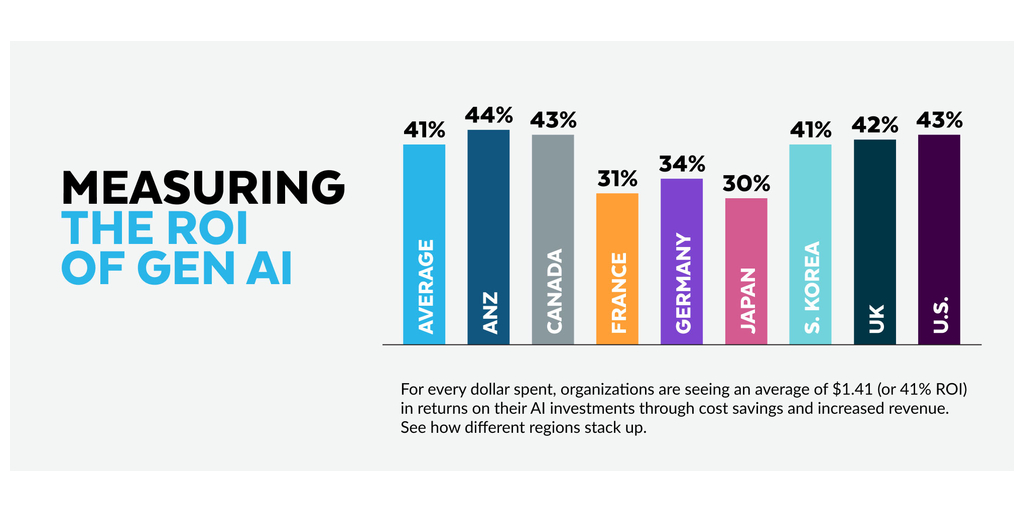 - Two-thirds of respondents are quantifying their AI ROI, finding that for every dollar spent, they are seeing $1.41 in returns through cost savings and increased revenue