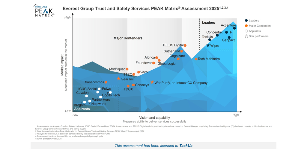 TaskUs' placement as a Leader in the Everest Group’s Trust and Safety Services PEAK Matrix® Assessment 2025 reflects its high measures across a broad range of assessment criteria, including vision and strategy, value delivered, and innovation and investments. The Assessment spotlights the company’s full spectrum of services across the Trust & Safety value chain, AI support services, real-time dashboarding, and partnerships with multiple technology providers. The report also highlights TaskUs’ Wellness-as-a-Service offering.