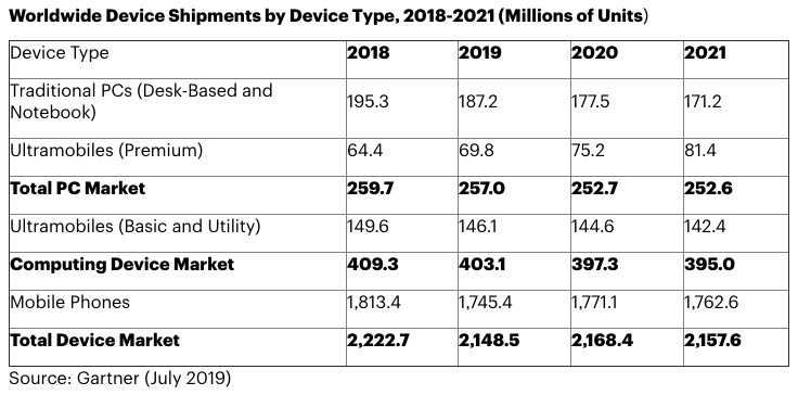 Secondo l’ultima analisi di Gartner, le spedizioni in tutto il mondo di device, ossia Pc, tablet e telefoni cellulari, raggiungeranno 2,2 miliardi di unità nel 2019, un dato che rappresenta un calo del 3,3% anno su anno.