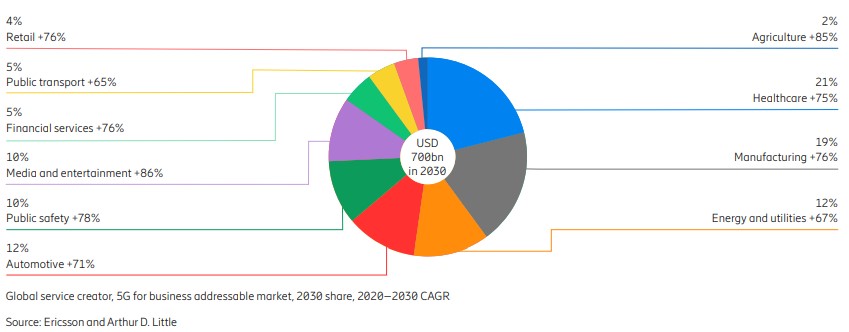 L’agricoltura, infine, è alla ricerca di soluzioni per l’automazione, per il controllo remoto delle tenute agricole e per l’ottimizzazione delle risorse. Il 5G può giocare un ruolo importante in questo contesto, anche se la digitalizzazione del comparto procede in modo più lento rispetto ad altri settori. Il business 5G stimato è di 11 miliardi di dollari nel 2030.