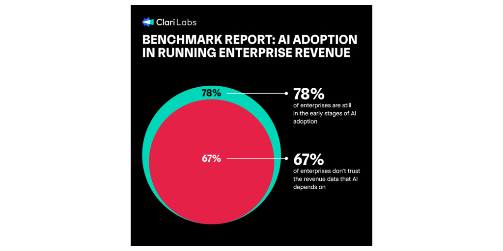 SUNNYVALE, Calif.--(BUSINESS WIRE)--New research from Clari Labs on AI Adoption in Running Enterprise Revenue shows that while AI is proven to unlock revenue growth, 78% of enterprises are still in the early stages of AI adoption — and 67% of enterprises don’t trust the revenue data that AI depends on. To unlock the full potential of AI and agents, enterprises must re-architect how they run revenue.