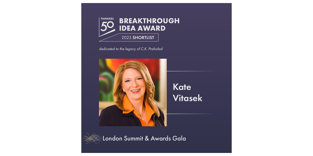 SEATTLE--(BUSINESS WIRE)--Kate Vitasek, architect of the Vested® business model, internationally recognized keynote speaker, and author of eight books, has been shortlisted for the 2025 Thinkers50 Breakthrough Idea Award.