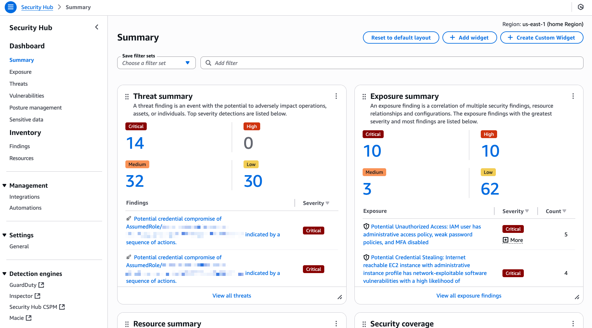 - Threats: aggrega le minacce rilevate da GuardDuty, inclusi attacchi complessi e anomalie comportamentali.