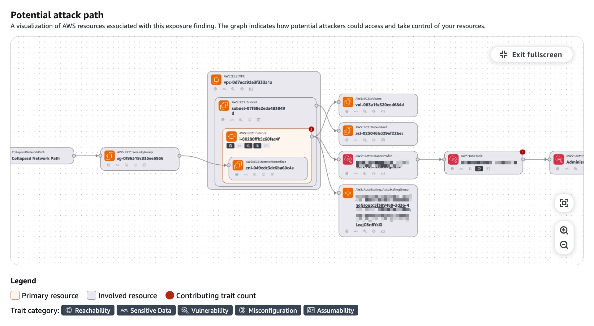 L’analisi tiene conto di tutti i componenti di rete coinvolti, come VPC, subnet, security group, NACL, e bilanciatori di carico, così come dei legami IAM che potrebbero portare a escalation di privilegi o data exfiltration. I tratti contribuenti sono evidenziati per facilitare l’individuazione del rischio primario, e la possibilità di accedere alla configurazione dettagliata della risorsa semplifica ulteriormente la pianificazione della remediation.