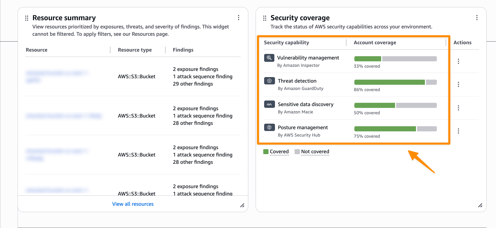 Security Hub non si limita a rilevare i problemi, ma aiuta a costruire un’architettura resiliente e una cultura della preparazione. Il nuovo widget Security Coverage fornisce una mappa della copertura di sicurezza, indicando dove le capability (come GuardDuty o Macie) non sono ancora attive su specifici account o regioni. Questo supporta il miglioramento continuo della postura globale.