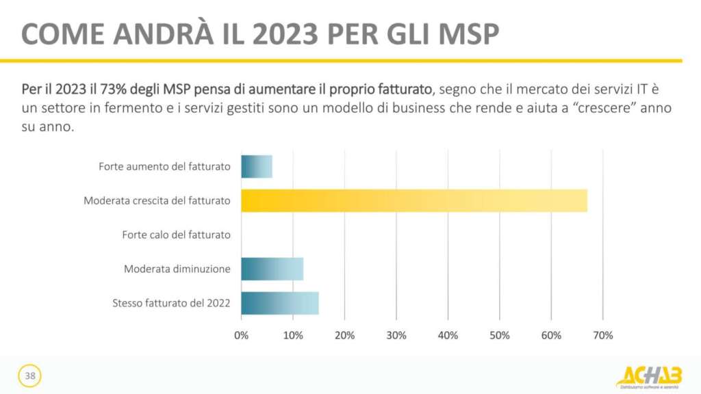 Per capire come è andato il 2022 basta osservare che il 63% dei rispondenti ha aumentato il proprio fatturato e solo il 3% lo ha diminuito. Tra i primi, il 42% ha aumentato il fatturato del 15% o più. Analogo andamento vale per il margine poiché il 68% degli intervistati lo ha aumentato e tra questi, il 32% dell’oltre 20%. Tirando le fila di questo anno appare evidente lo spirito positivo degli MSP nel volgere lo sguardo all’anno in corso, il 73%, infatti, è convinto di poter incrementare ulteriormente il fatturato, segno che il mercato dei servizi IT è un settore in fermento e che il modello di business aiuta a “crescere” anno su anno.