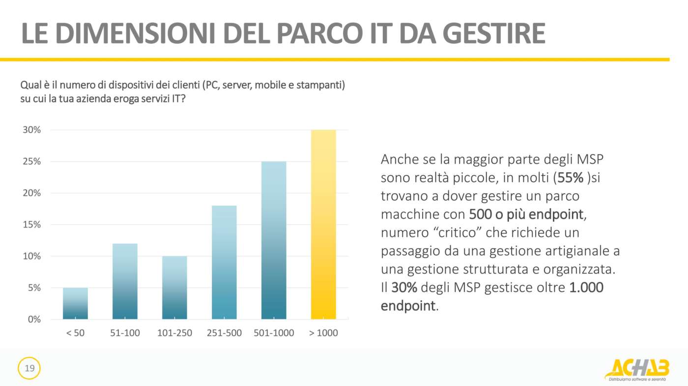 Anche tra le piccole realtà, la maggior parte di queste (il 54%) si trova comunque a dover gestire un parco macchine con 500 o più endpoint mentre il 30% ne gestisce oltre 1000; si tratta di numeri critici che indicano quanto sia necessario ormai un passaggio da “artigiano dell’IT” a “imprenditore dell’IT”.