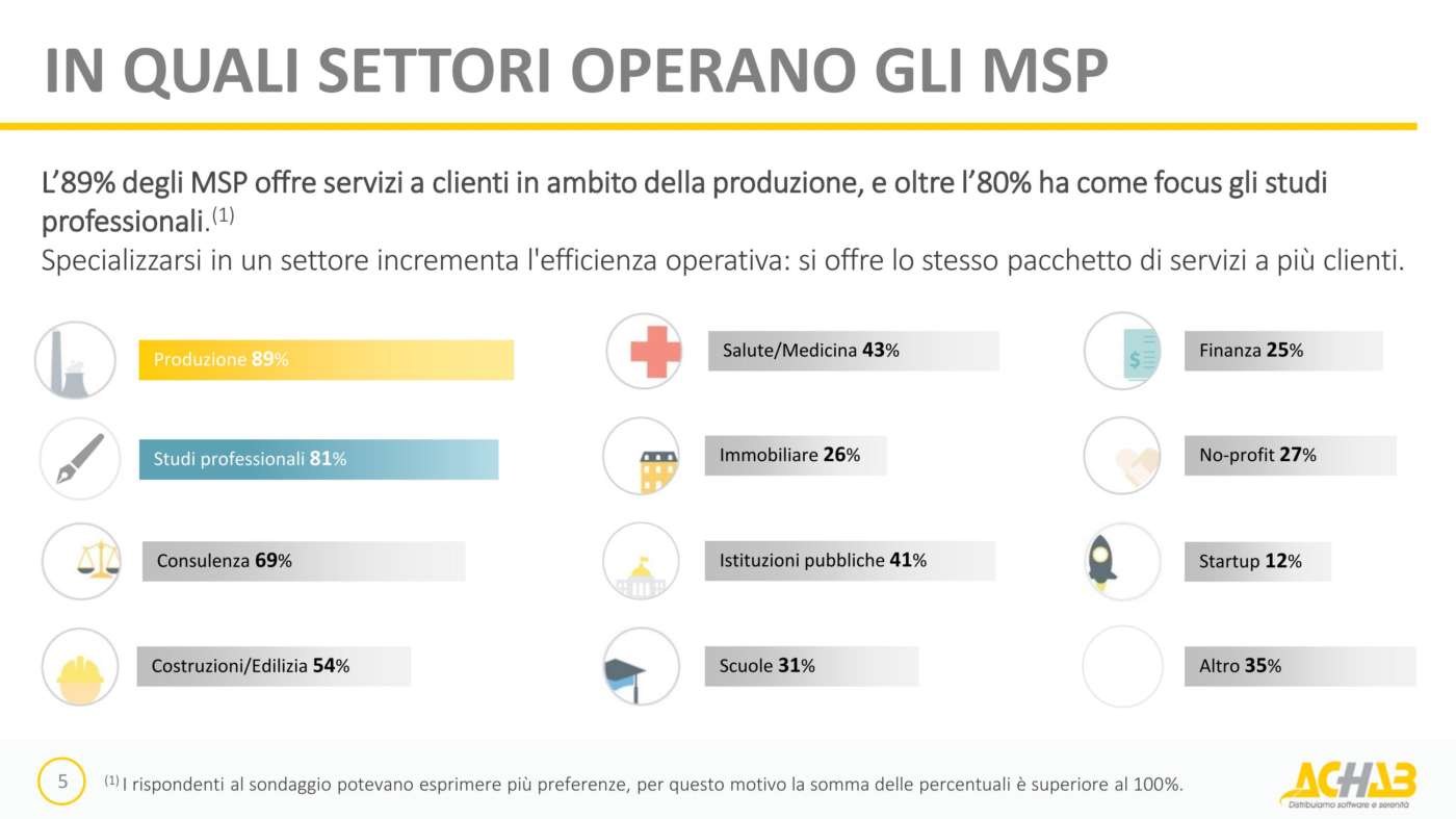 Ma in quali settori operano, per lo più, gli MSP italiani? Come si evince dal report, la quasi totalità dei rispondenti (89%) è attivo nell’ambito della produzione mentre oltre 80% ha come focus gli studi professionali, dati che evidenziano un incremento dell’efficienza operativa in quanto la specializzazione in un settore offre la possibilità di fornire lo stesso pacchetto di servizi a più clienti.