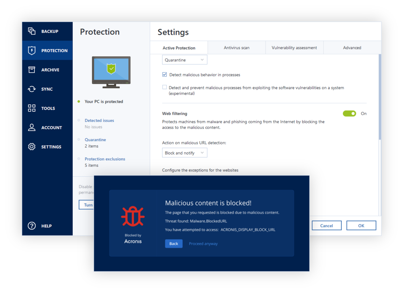La protezione totale degli utenti è garantita dalla Cyber Protection integrata con funzionalità anti-malware e anti-ransomware e dal backup affidabile, rapido e sicuro. Il prodotto rappresenta uno strumento per la protezione totale dei dati di utenti privati, famiglie e piccoli uffici. La grande facilità d’uso è garantita dall’interfaccia intuitiva e moderna, dalle funzionalità di cybersecurity e dal backup e ripristino con un solo clic.