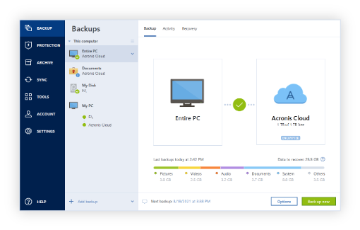 Disponibile sia per sistemi operativi Windows che macOS, con un unico abbonamento consente di proteggere fino a cinque computer e un numero illimitato di dispositivi mobili e tablet. Acronis True Image archivia e protegge oltre 42.000 terabyte di dati utente nel cloud e migliaia di terabyte aggiuntivi su dispositivi locali.