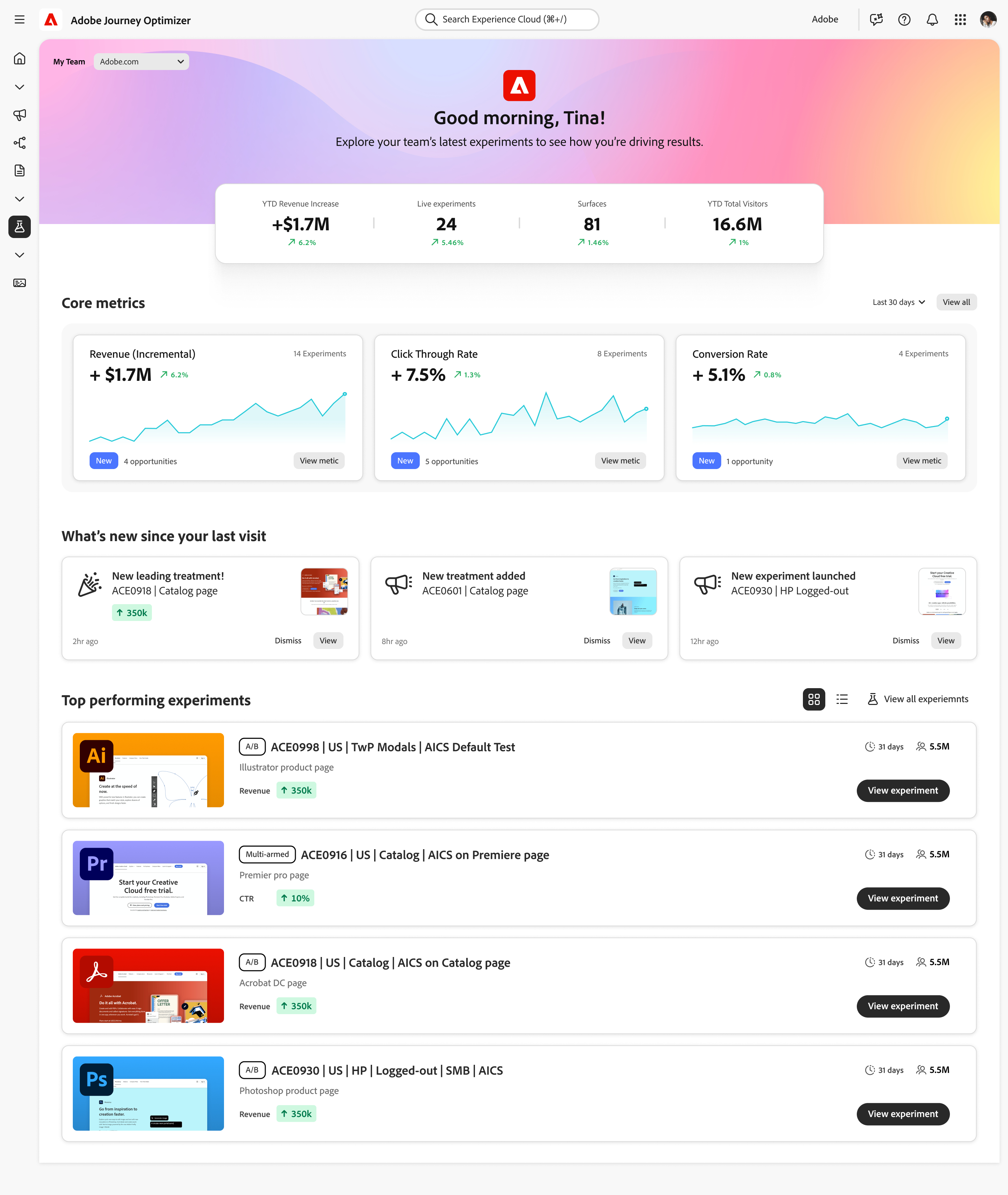 Teams can then apply recommended experiments within active customer journeys and campaigns in AJO and test activities in Adobe Target. Powered by unified, real-time data in AEP, AJO Experimentation Accelerator enhances the ability to learn and optimize, providing cross-functional teams a single, self-service view of active and historical experiment learnings across key business metrics, performance impact and growth drivers. It democratizes insights to help scale experimentation programs across an organization.
