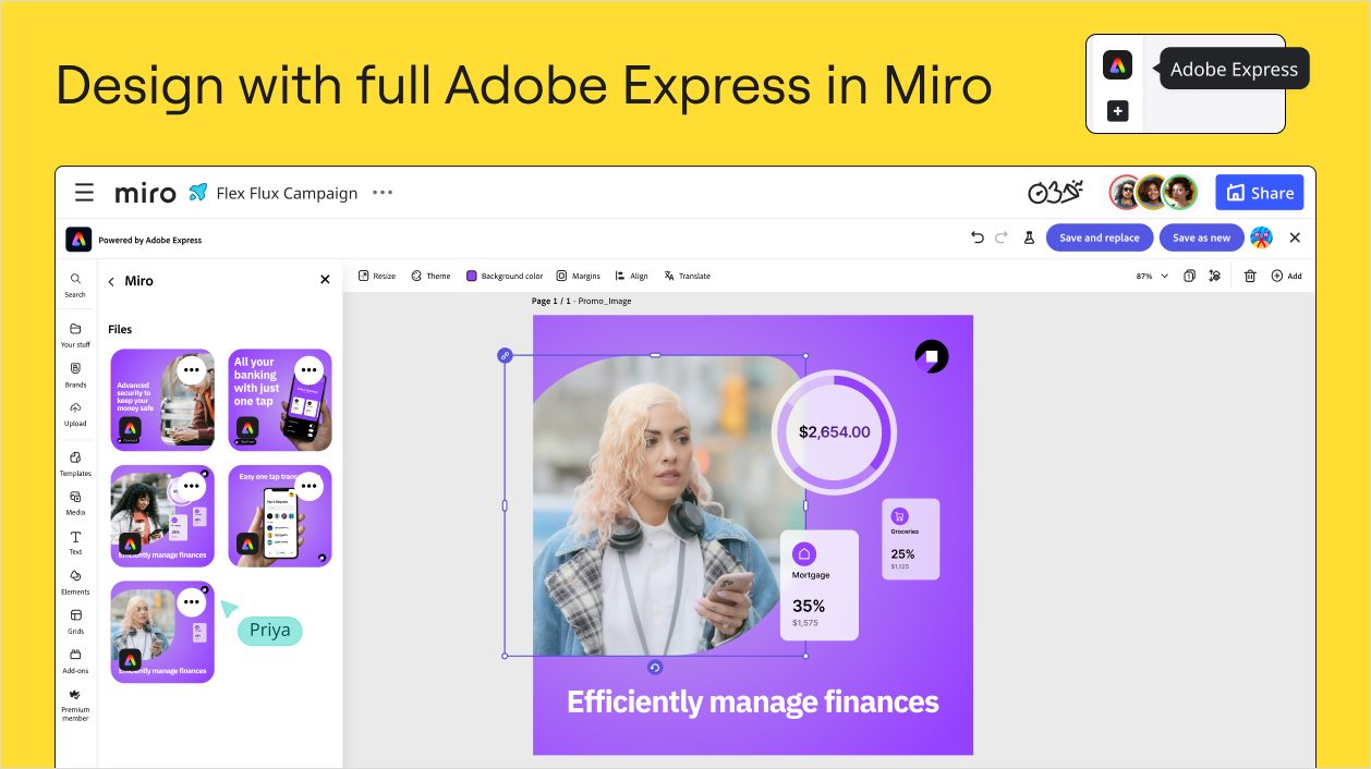 Che si stia pianificando una campagna, organizzando un workshop o facendo brainstorming sulla prossima idea, ora è possibile progettare e iterare con Adobe Express, senza mai dover uscire da Miro.