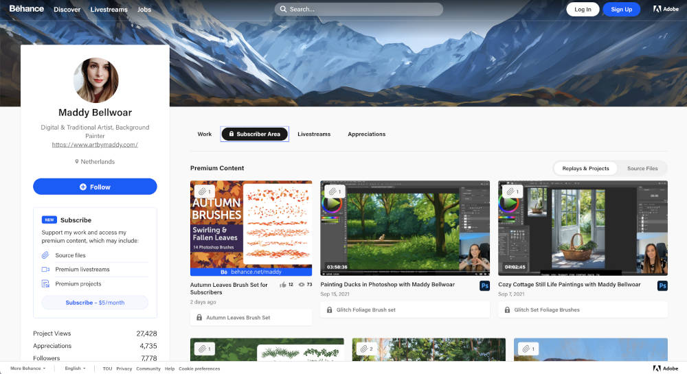 Gli abbonati a Adobe Creative Cloud possono offrire abbonamenti che danno l’accesso esclusivo a livestream selezionati, file sorgenti e altro su Behance. E Behance non prende alcuna percentuale su ciò che il creativo professionista guadagna.