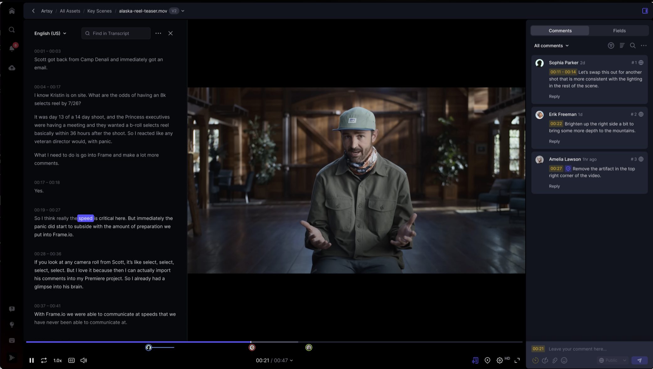 - Trascrizione automatizzata (beta) che consente di trascrivere rapidamente file video e audio direttamente in Frame.io, con strumenti intuitivi per la navigazione e la ricerca testuale, oltre alla possibilità di esportare in diversi formati.