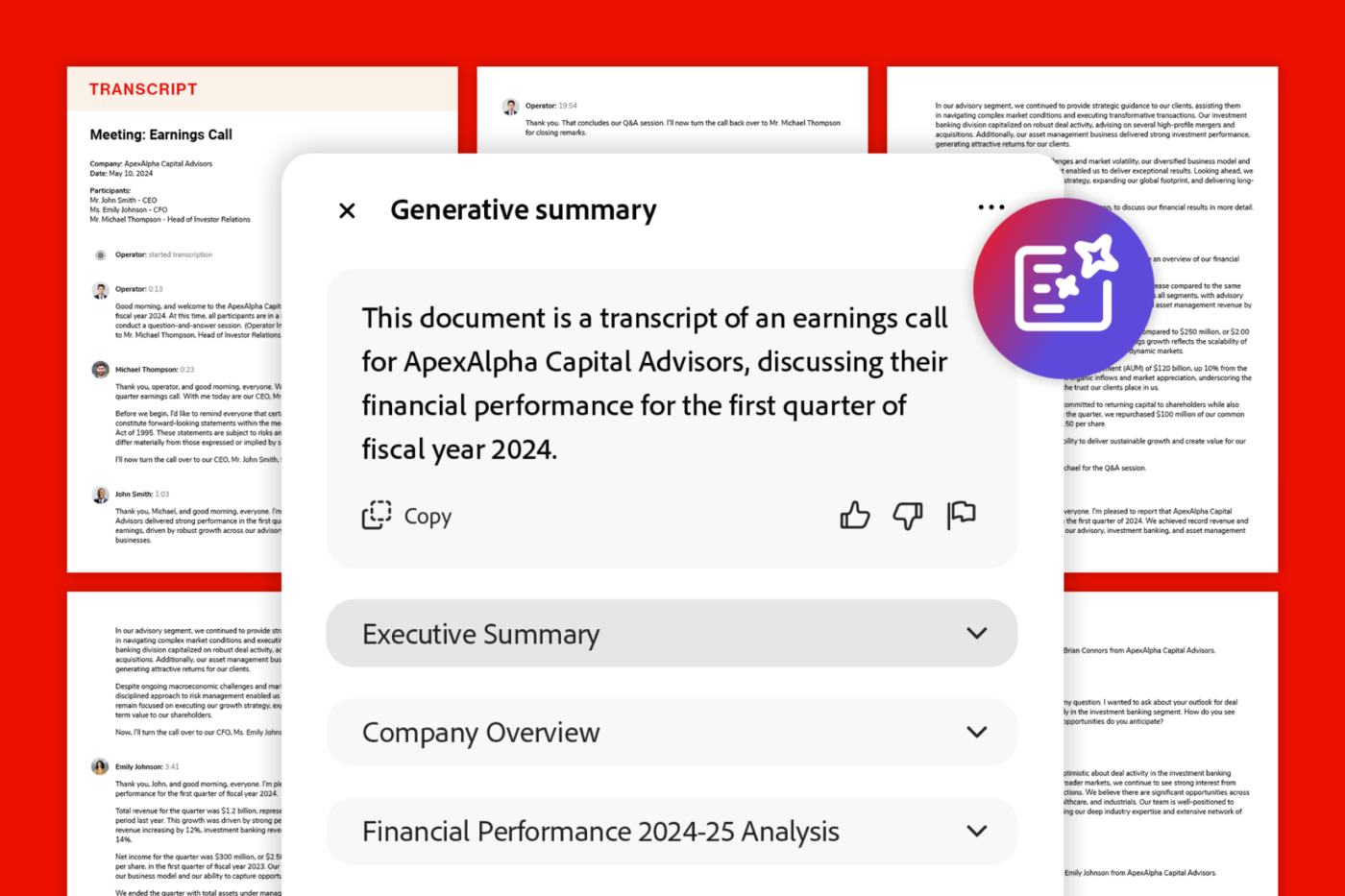 Le nuove funzionalità di Acrobat AI Assistant, un motore di conversazione profondamente integrato nei flussi di lavoro di Reader e Acrobat, consentono agli utenti di porre domande, ottenere insight e creare contenuti a partire da informazioni su gruppi di PDF e altri tipi di documenti, tra cui Microsoft Word, Microsoft PowerPoint, file di testo e molto altro. Adobe ha inoltre annunciato il potenziamento delle funzionalità di trascrizione delle riunioni in AI Assistant.