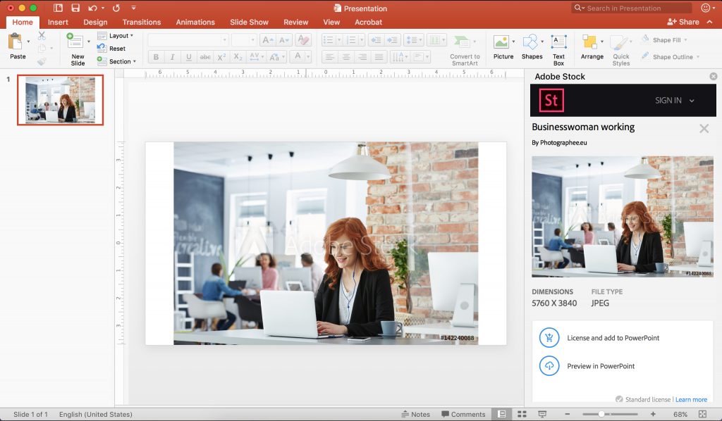 Una volta trovata un’immagine che potrebbe fare al caso nostro, è possibile vederne un’anteprima nel layout della presentazione, prima di acquisire la licenza dell’asset. La cronologia delle licenze è sempre a portata di mano eseguendo il login con il proprio account Adobe Stock. Ciò facilita, ad esempio, il riutilizzo di immagini già licenziate in precedenza, così come il mantenere la coerenza grafica tra la presentazione e l’eventuale progetto in fase di realizzazione con le app di Creative Cloud.