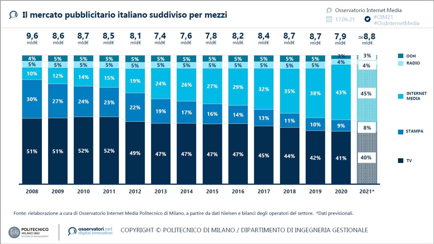 Nel 2020 l’Internet advertising ha raggiunto i 3,45 miliardi di euro, pesa il 43% del totale e supera per la prima volta in Italia la Tv, ferma al 41%; seguono Stampa (9%), Radio (4%) e Out of Home (3%).