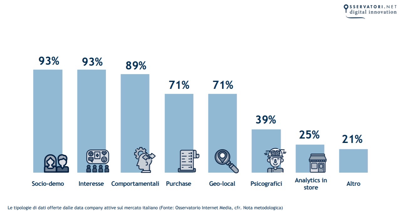 Tra le più diffuse troviamo i dati socio-demo (come sesso, età o reddito) e di interesse, venduti dal 93% dei provider. Seguono i dati comportamentali (ad esempio, cronologia di navigazione e ricerche sui browser), venduti dall’89%. I dati di purchase (legati agli acquisti) e i dati geo-local (per fornire all’utente messaggi contestuali alla sua posizione) venduti dal 71%. Infine i dati psicografici, che si focalizzano sulla comprensione degli attributi cognitivi, come ad esempio le emozioni dei consumatori, al 39%. E gli analytics in store (comportamento in punto vendita, 25%).