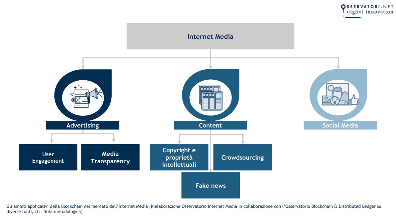 All’interno del mondo media, una delle aree di applicazione più importante è quella dell’advertising online. La Blockchain può essere associata in particolare a due ambiti applicativi. Il primo: la user engagement, ossia tutte quelle soluzioni che permettono di coinvolgere l’utente in modo attivo all’interno della filiera pubblicitaria. E poi la media trasparency, ossia tutte quelle soluzioni che permettono di favorire la trasparenza all’interno della filiera pubblicitaria.