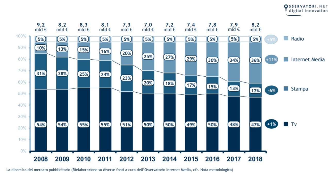 Buone notizie per quanto riguarda il panorama media e advertising, soprattutto su Internet. Il mercato pubblicitario complessivo in Italia chiude infatti il 2018 a quota 8,2 miliardi di euro. Dunque in crescita del 4% rispetto al 2017.