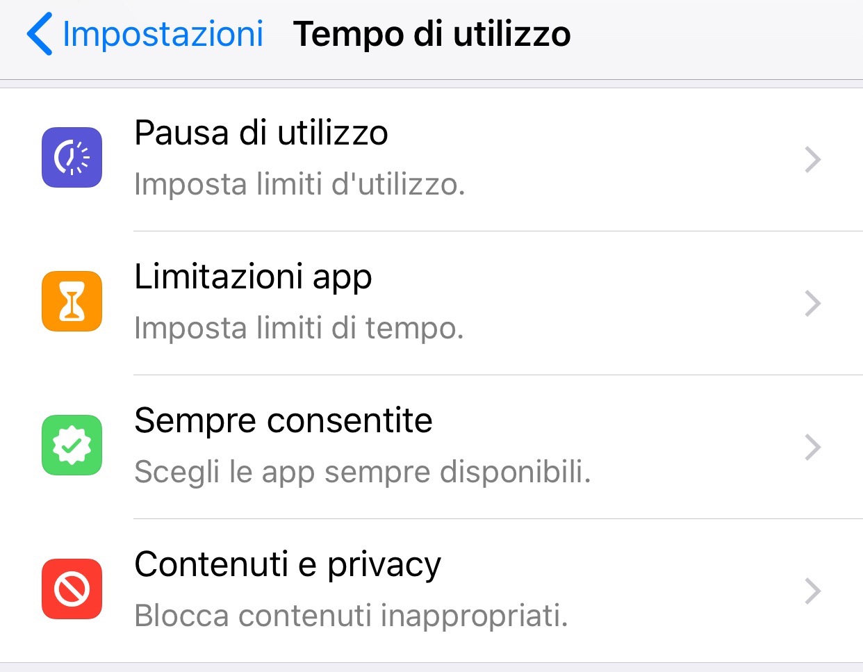 • Pausa di utilizzo: qui puoi impostare delle limitazioni generali all’utilizzo del tuo iPhone, un lasso di tempo nel quale sono consentite solo le chiamate e le app selezionate.