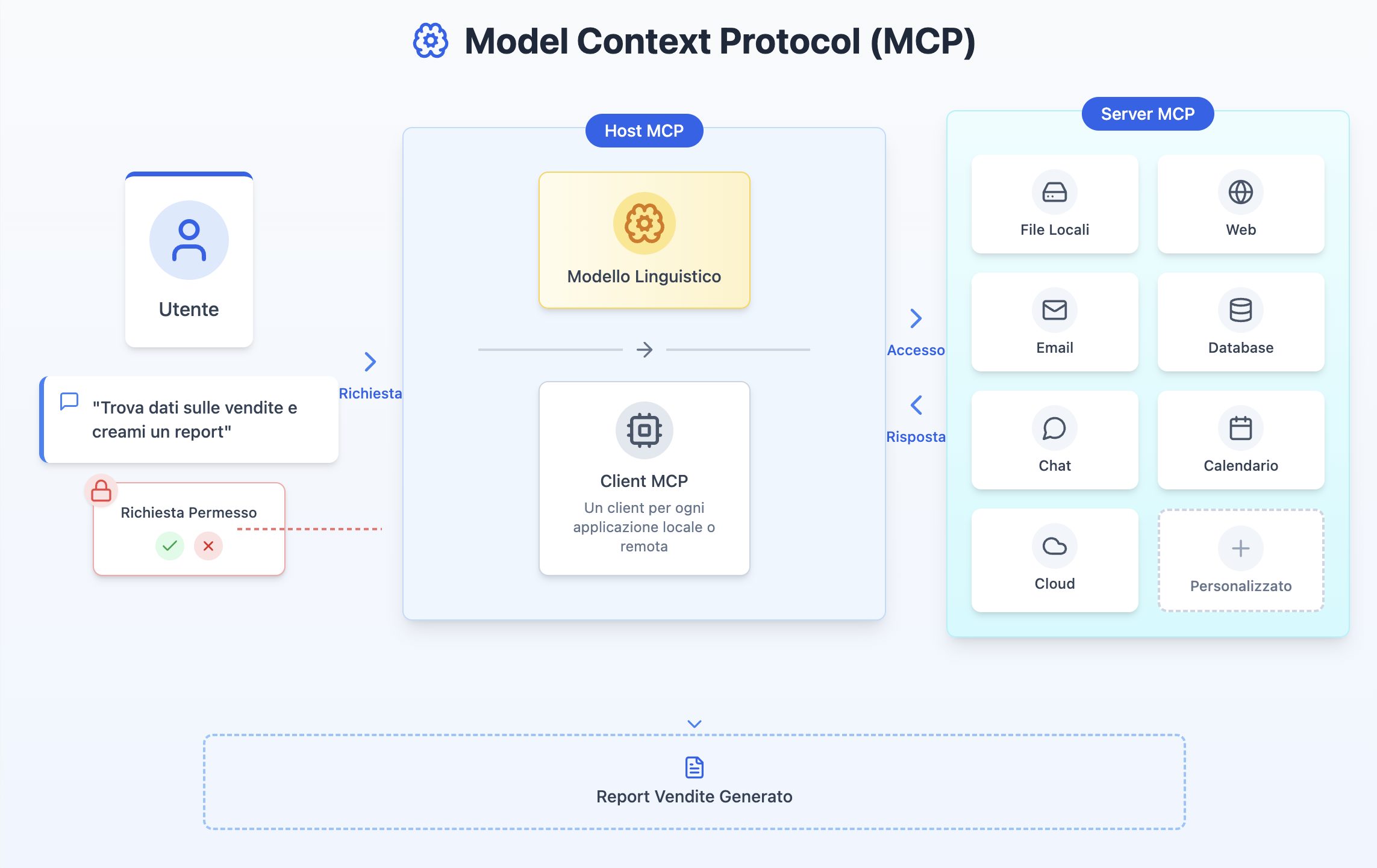 Prima di iniziare, facciamo un po’ di chiarezza. Il Model Context Protocol (MCP) è uno standard aperto creato da Anthropic che permette ai modelli linguistici (LLM) di comunicare in modo standardizzato con dati esterni e strumenti software.