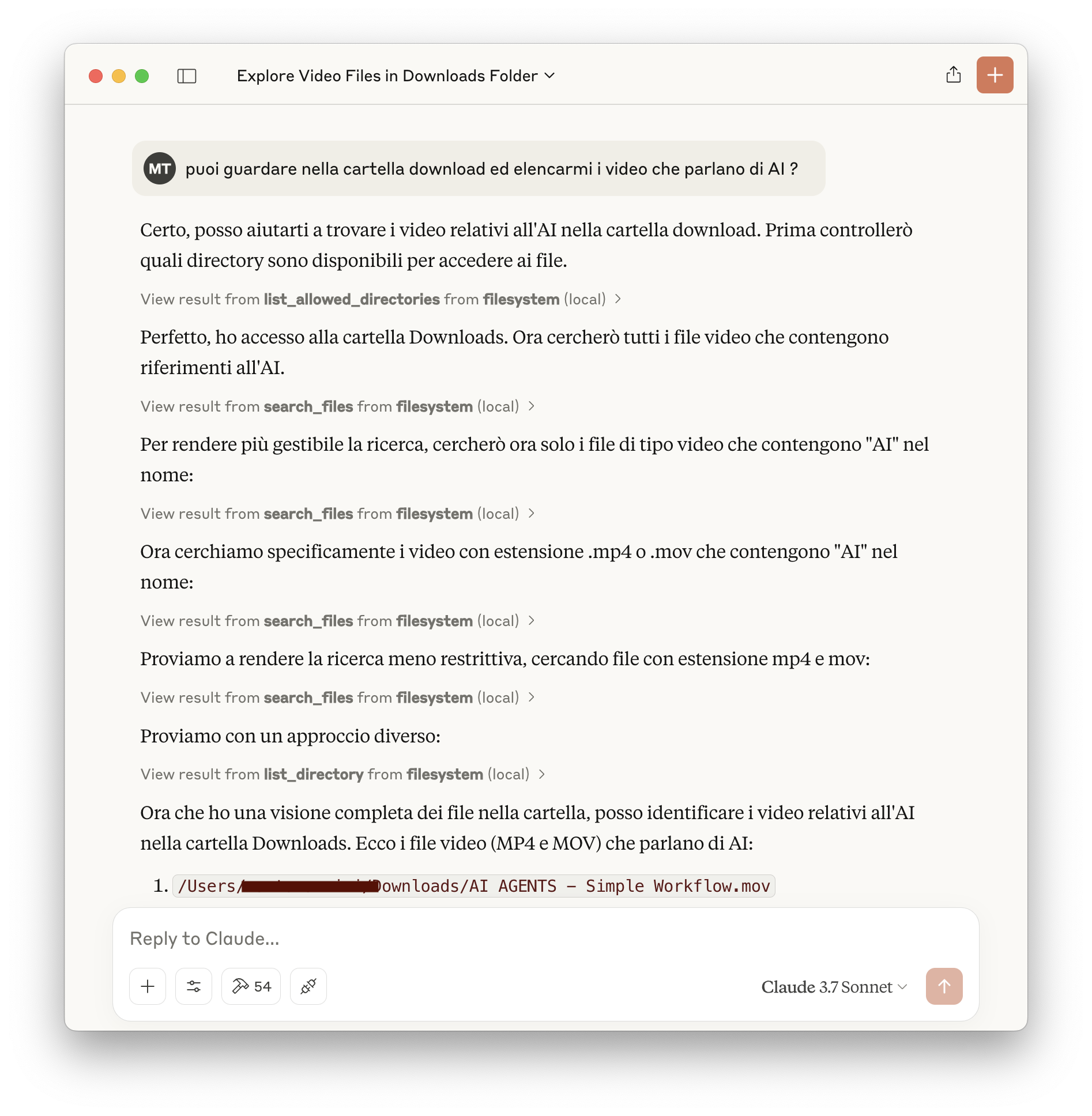Per ciascuna di queste richieste, Claude utilizzerà il server MCP filesystem per accedere ai documenti, vi chiederà conferma prima di procedere, e poi eseguirà l’analisi richiesta.