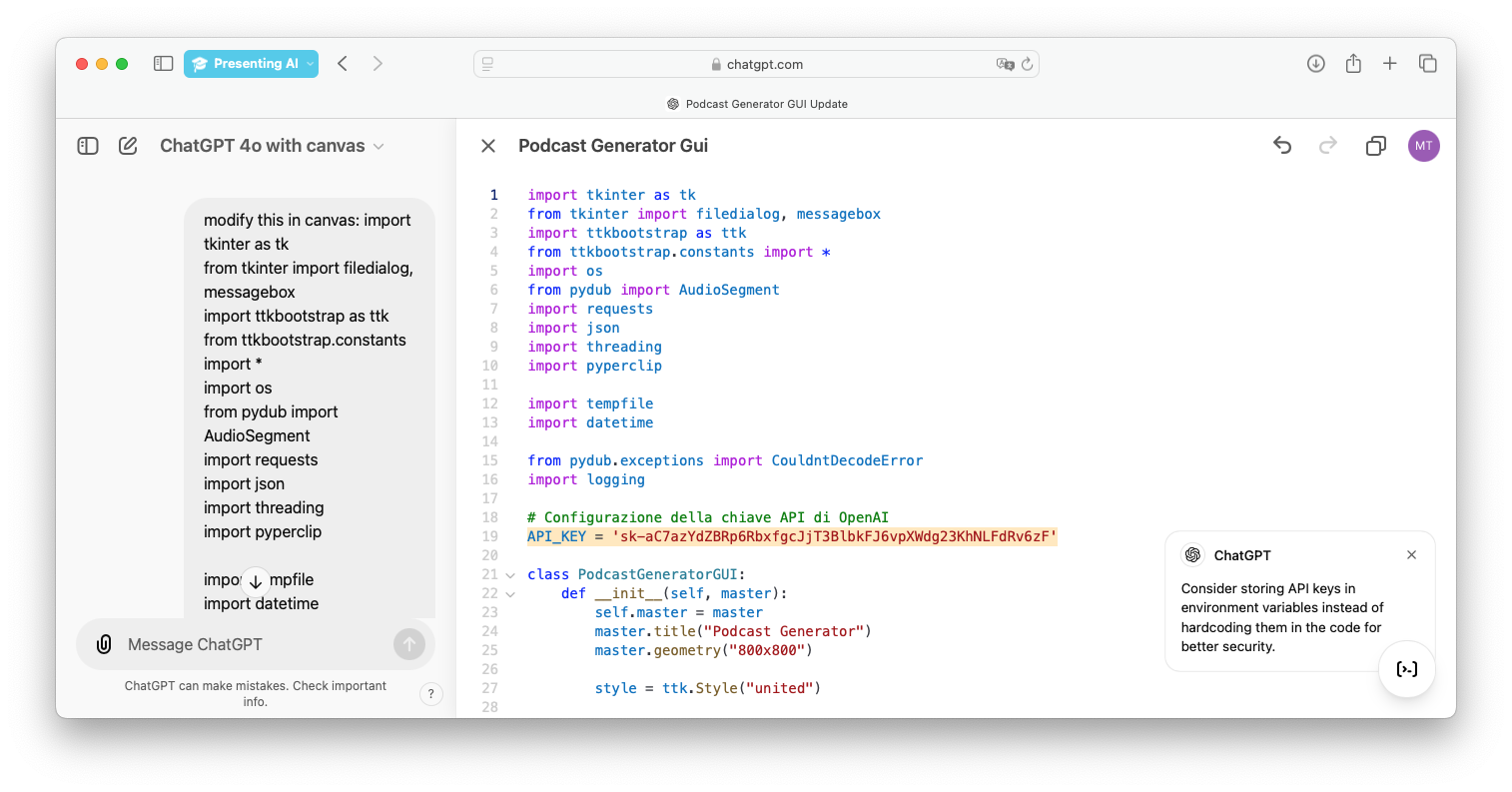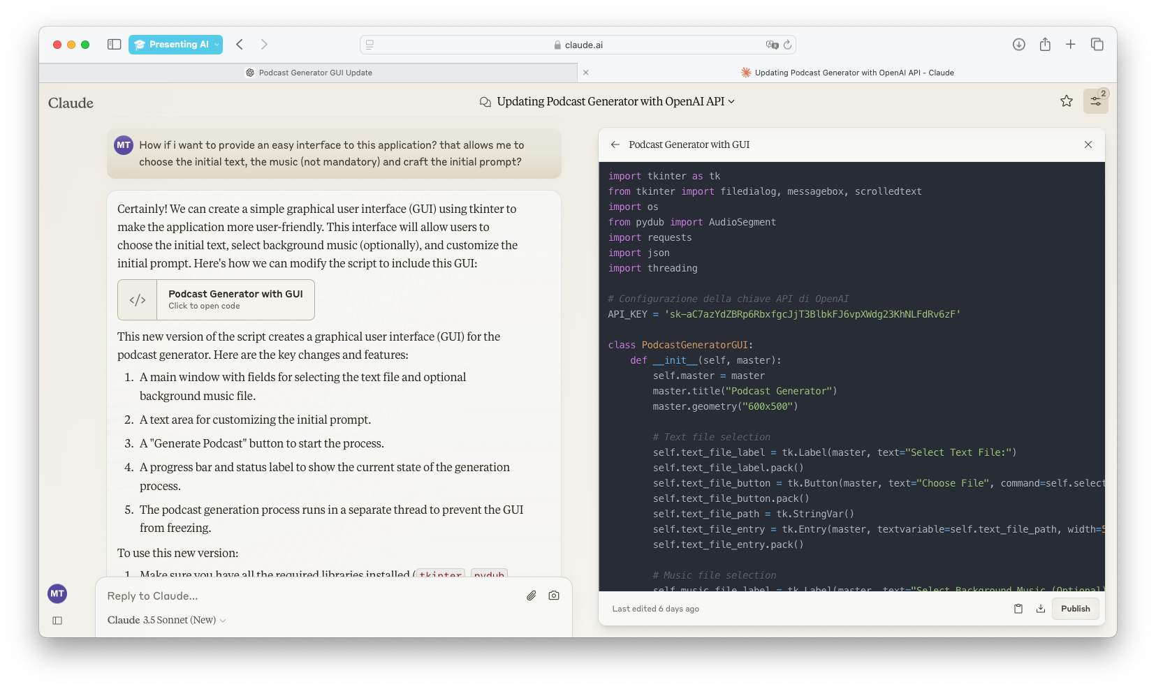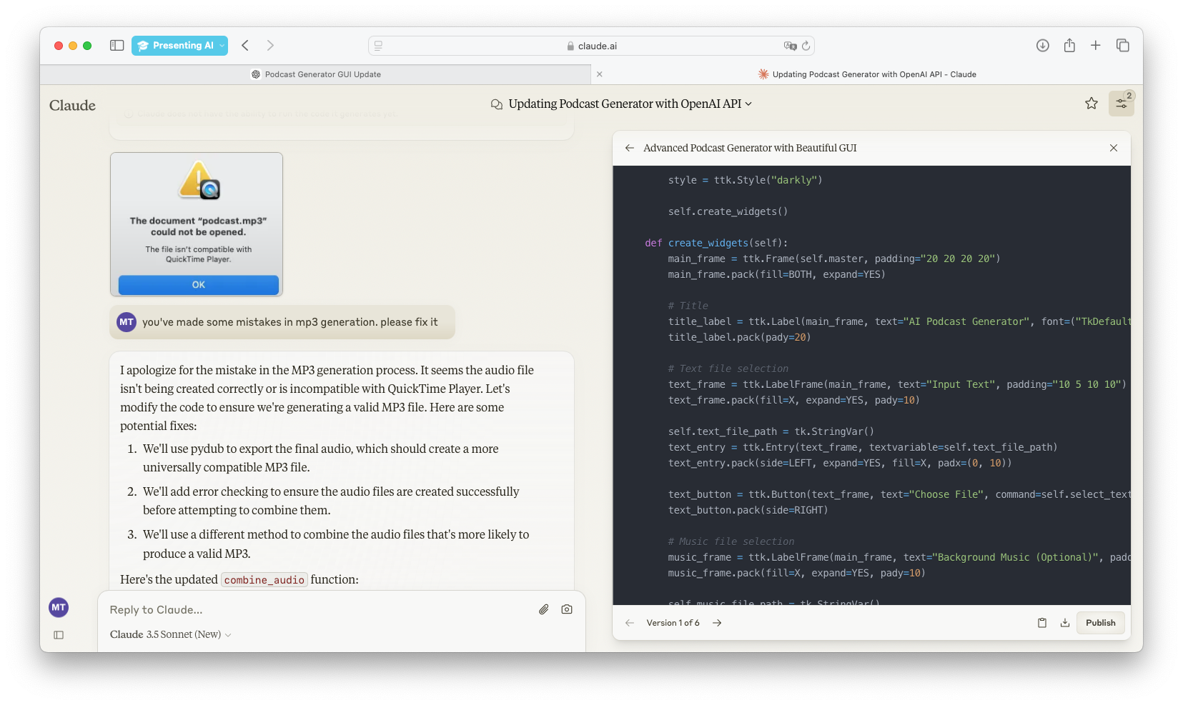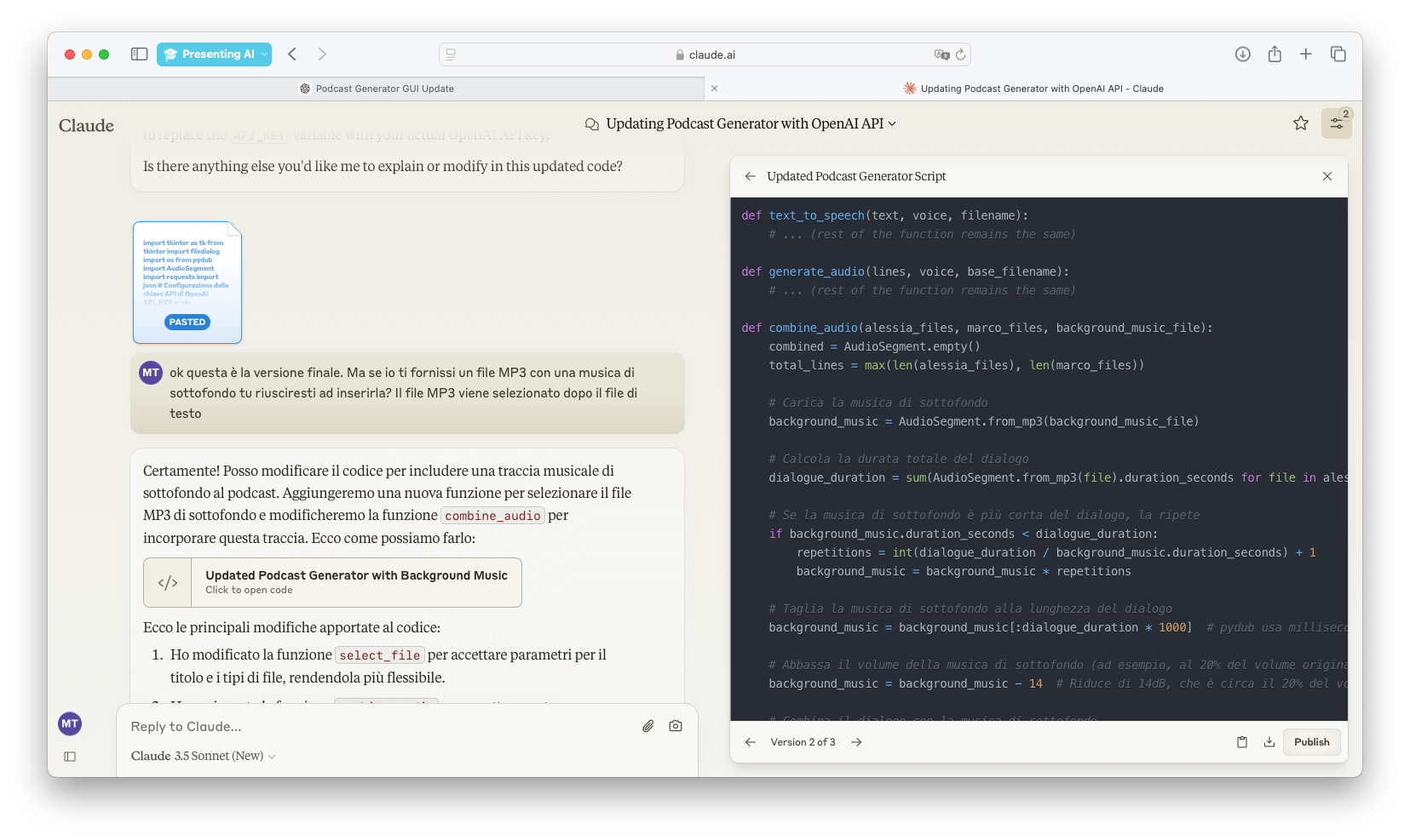 La prima versione dell’applicazione risultava quasi funzionante, ma utilizzava una vecchia chiamata API ad OpenAI, ormai deprecata. A questo punto ho utilizzato Claude per sistemare la parte di codice che non funzionava. Dopo diverse interazioni, finalmente avevo uno script funzionante: l’applicazione apriva una finestra di dialogo, selezionava un file di testo e generava un podcast con due voci.