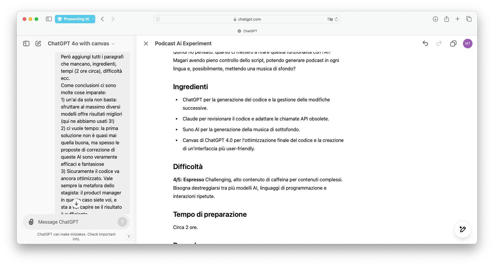 Ero stanco però di copiaincollare e mi sono ricordato della nuova funzionalità Canvas di Chat GPT.