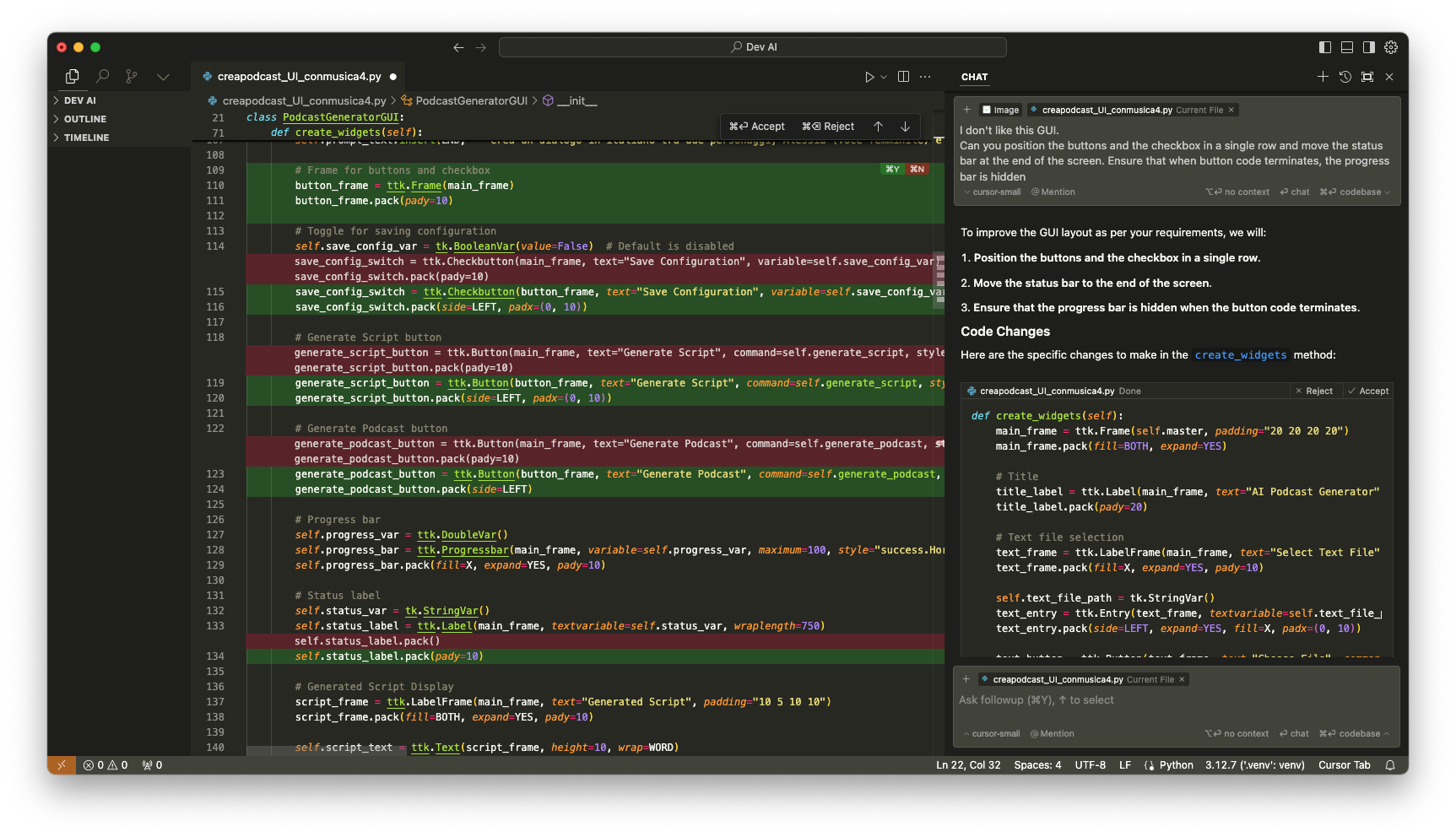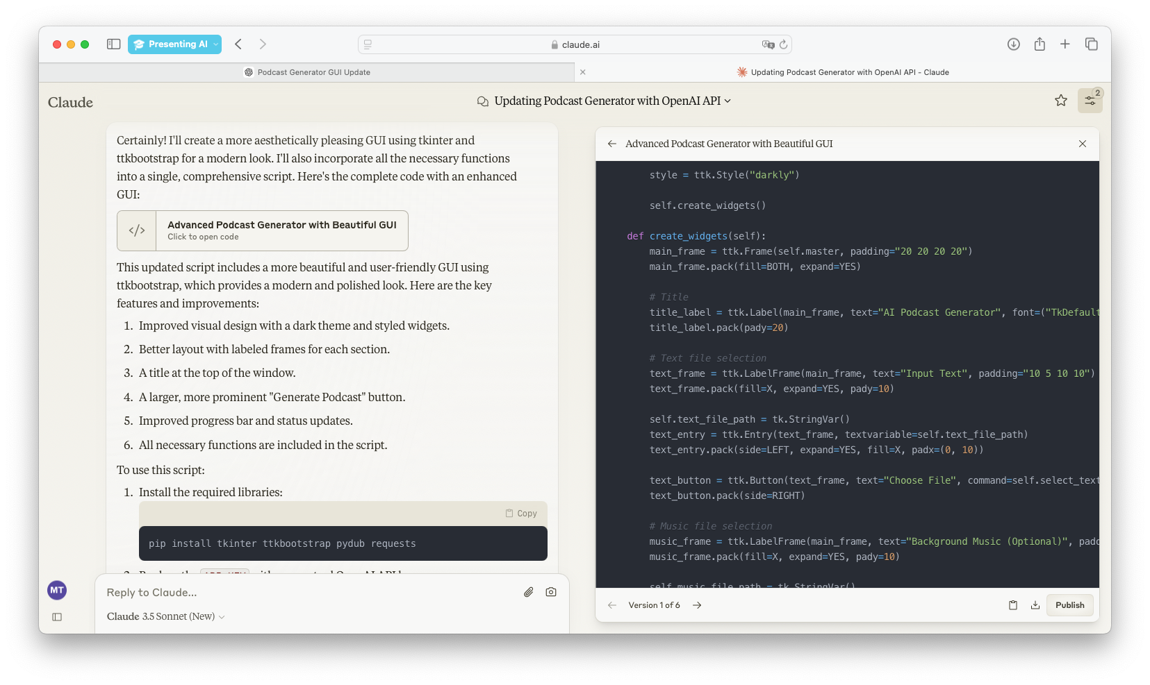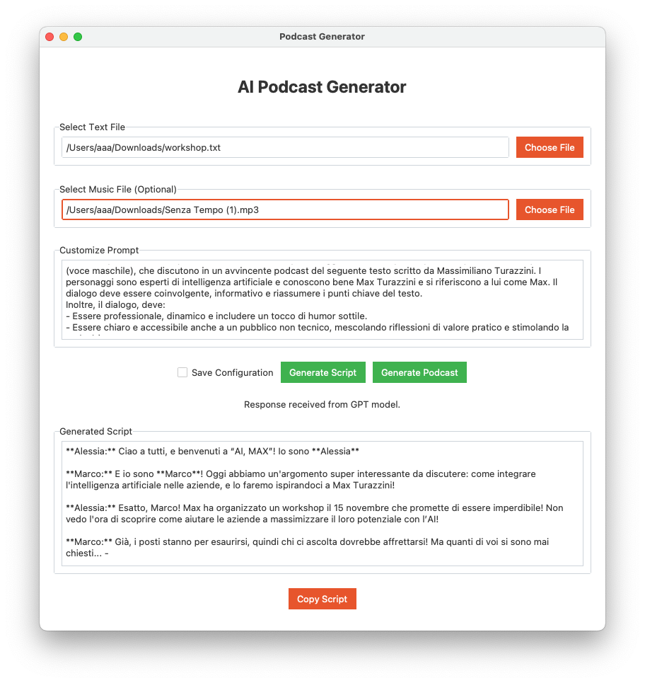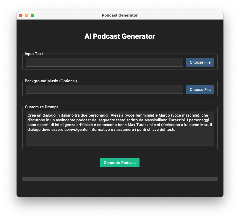 Il risultato? Una prima app quasi funzionante che fa partire una finestra di dialogo per scegliere un file da convertire in un podcast a due. Lo script genera il dialogo, converte il testo in audio e combina gli audio in un unico file mp3.