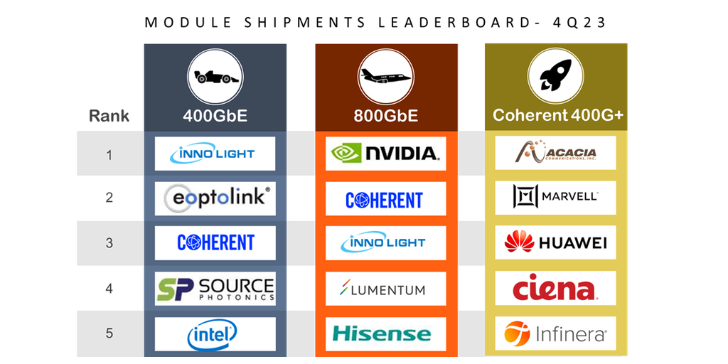 - Huawei, Infinera, Acacia, and Nokia shipped Gen120P 1.2T high speed coherent ports for revenue in 4Q23, which is the first quarter of production shipments for this new technology.