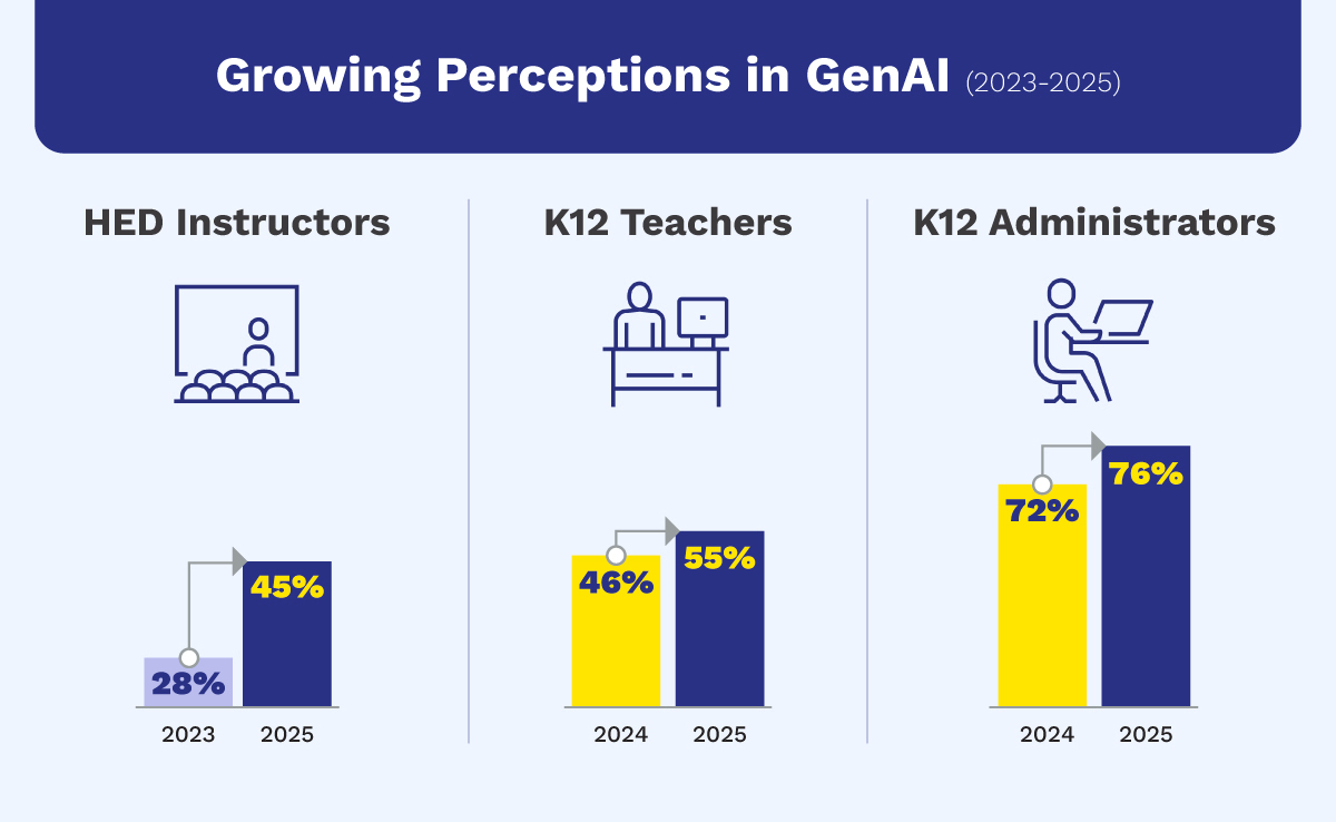 This edition, which surveyed over 3,000 higher education (HED) students and instructors and over 1,000 K12 teachers and administrators, found similarities among HED instructors’ and K12 teachers’ optimism for GenAI specifically. Nearly half of HED instructors (45%) and almost three in five K12 teachers (55%) have positive perceptions about GenAI, despite concerns and perceived risks in its adoption.