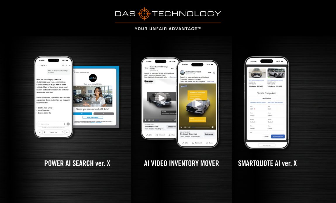 LAS VEGAS--(BUSINESS WIRE)--DAS Technology, the automotive industry’s leader in consumer engagement and sponsor of the 2026 J.D. Power Auto Summit, today announced three major AI-native advancements to its Customer Experience CX Platform: an AI-driven reputation and search visibility solution designed for emerging AI search experiences, a next-generation AI-enabled lead response solution, and an AI-powered video solution that dynamically transforms inventory imagery into high-performing video ads.