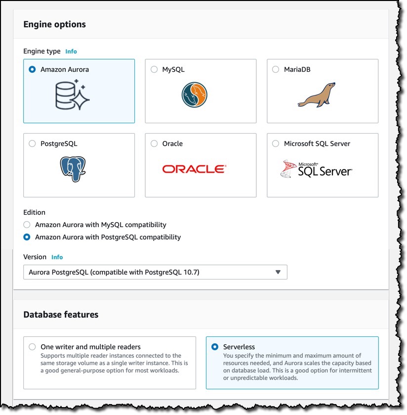 Attualmente, Aurora Serverless è compatibile con PostgreSQL versione 10.7 e l’opzione di attivazione è presente nella console di Amazon RDS.