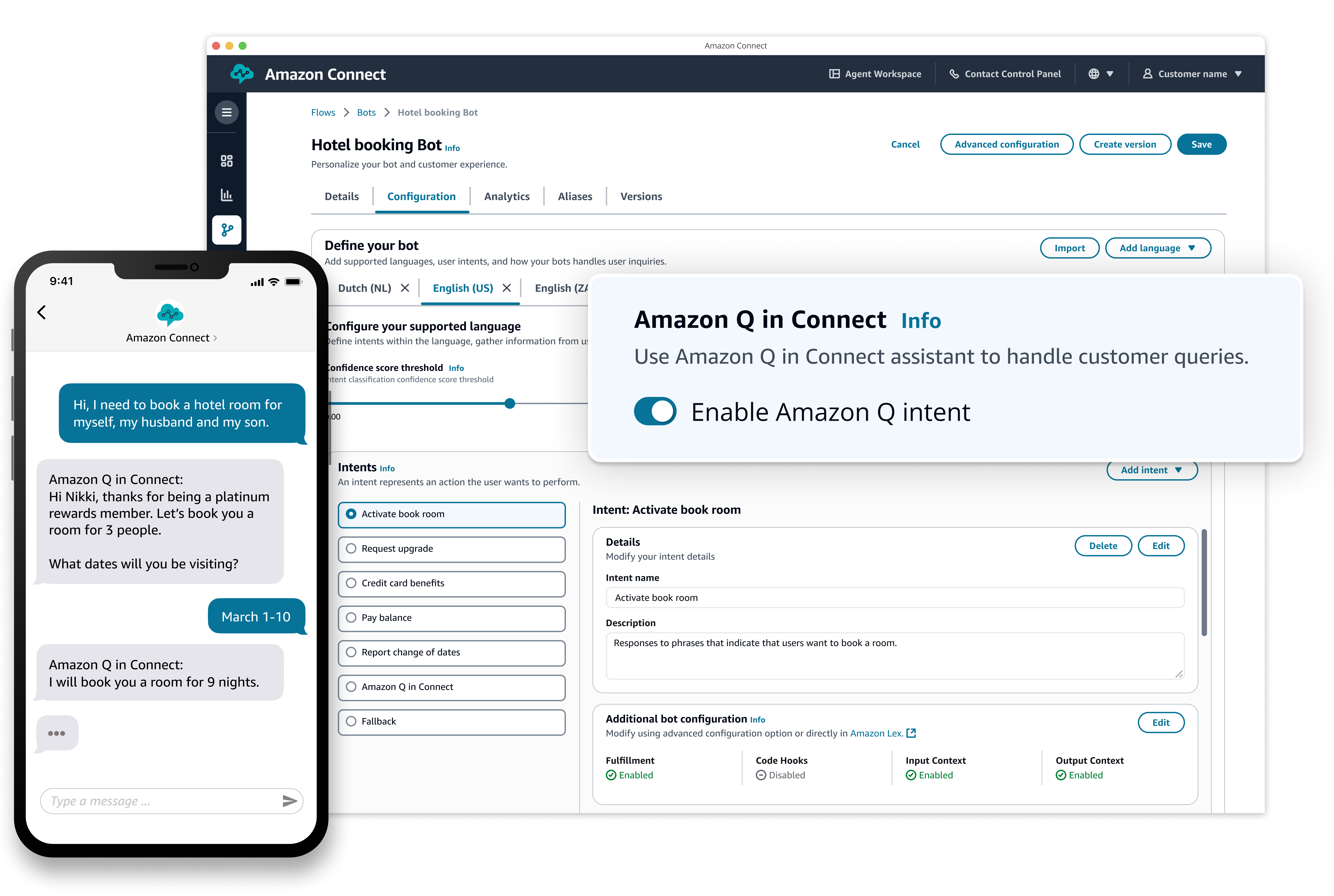 Amazon Q in Connect offre ora capacità basate su AI generativa per migliorare il servizio clienti self service, fornendo risposte personalizzate, azioni proattive e comprensione contestuale simili a quelle che fornisce agli agenti. Le organizzazioni possono creare, testare e migliorare rapidamente esperienze di self service basate su AI attraverso canali vocali e di chat. Per esempio, se un cliente chiede quali sono le opzioni di riprogrammazione disponibili per il proprio volo, Amazon Connect accede e analizza le informazioni specifiche del cliente prima di formulare una risposta. Questo include la verifica dello stato del cliente (ad esempio, livello di frequent flyer), la revisione della classe del biglietto e l’idoneità secondo le politiche della compagnia aerea. Amazon Connect utilizza questi dati per fornire una risposta personalizzata, offrendo opzioni di riprogrammazione che corrispondono allo stato, alle preferenze e all’idoneità del cliente.
