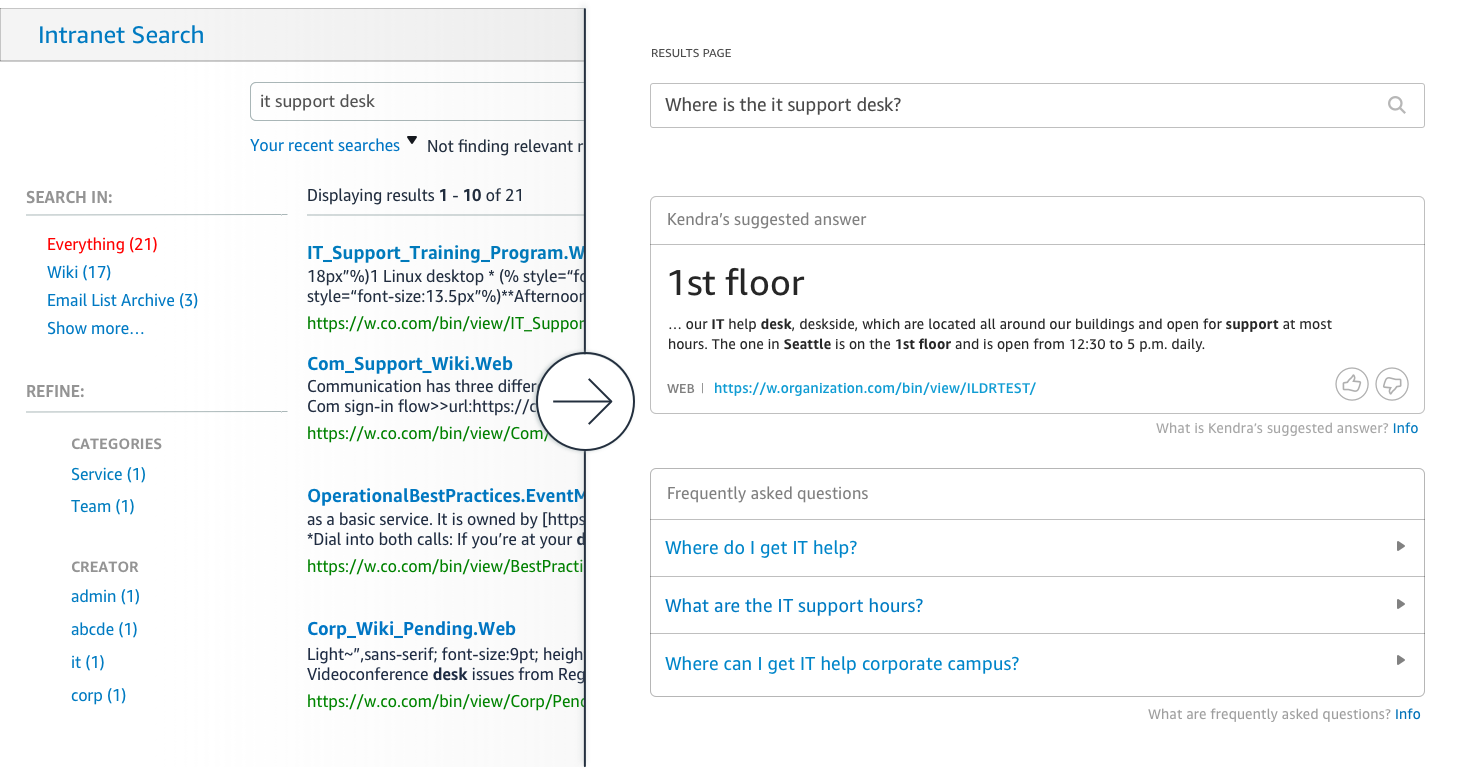 La società ha dichiarato che Amazon Kendra reinventa la ricerca aziendale consentendo agli utenti finali di cercare tra più silos di dati utilizzando domande reali (non solo parole chiave) e sfrutta i modelli di apprendimento automatico per comprendere il contenuto dei documenti e le relazioni tra di essi, allo scopo di fornire le risposte precise che cercano (invece di un elenco casuale di collegamenti).