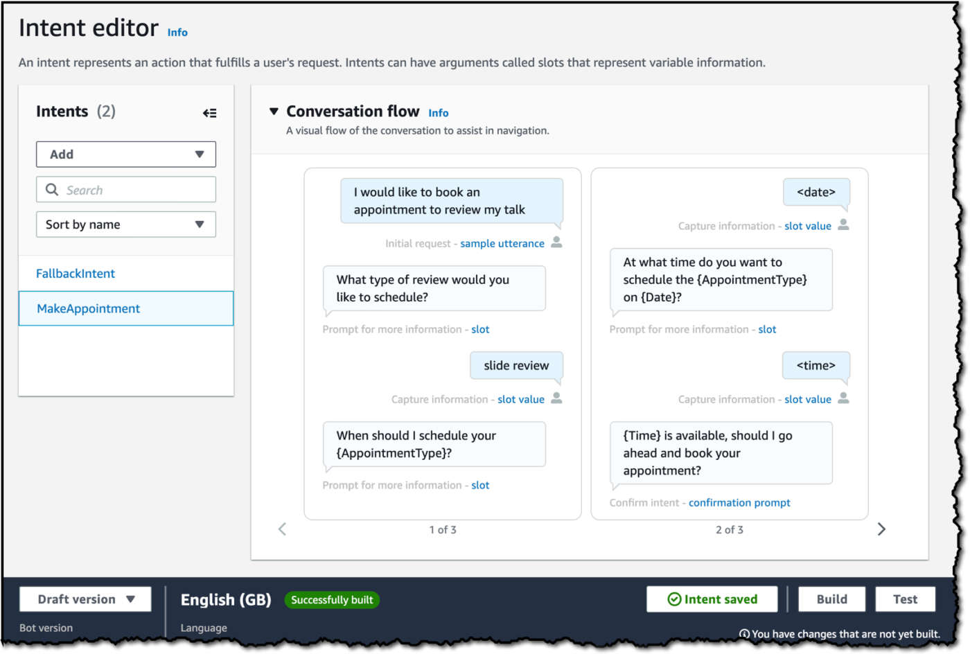 Oltre a salvare il lavoro parzialmente completato, è possibile anche navigare rapidamente nell’ambito della configurazione senza perdere i punti di riferimento. La nuova funzionalità Conversation flow permette di mantenere l’orientamento mentre ci si sposta tra i diversi intenti e tipi di slot.