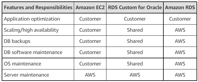 Il modello di responsabilità condivisa di RDS Custom for Oracle dà ai clienti più controllo che in RDS, ma anche più responsabilità, in modo simile a EC2.