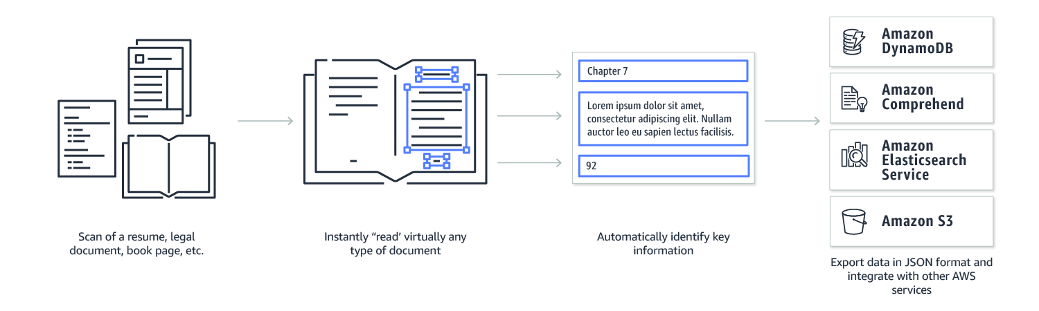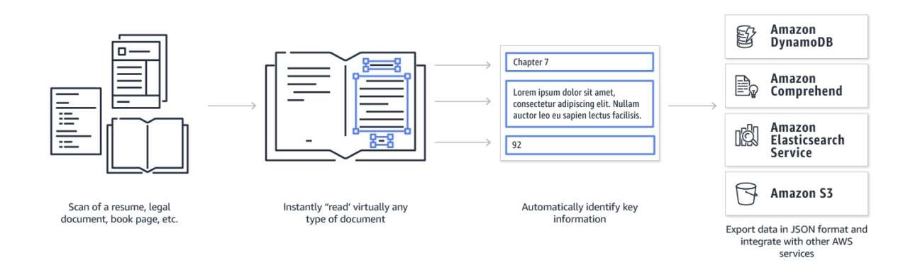 Amazon Textract prende i file scansionati memorizzati in un bucket Amazon S3, li legge e restituisce i dati sotto forma di testo JSON annotato con il numero di pagina, la sezione, le etichette dei moduli e i tipi di dati. Questi dati possono quindi essere utilizzati per una vasta gamma di applicazioni aziendali, come fogli di calcolo, database e sistemi gestionali.