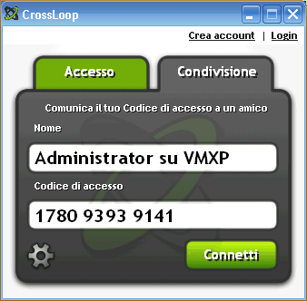 Per permettere il controllo da remoto del desktop, dopo l’avvio di CrossLoop, è necessario cliccare sulla scheda Condivisione quindi premere il pusante Connetti (l’interfaccia del software è traducibile in lingua italiana cliccando sull’icona raffigurando un ingranaggio, in basso a destra, selezionando Change language quindi Italiano).
