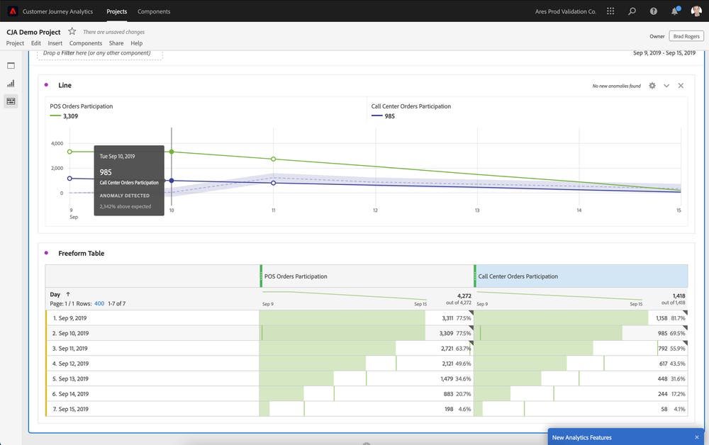 Una delle funzionalità più popolari di Adobe Analytics è Anomaly Detection, che è stata tradizionalmente utilizzata per l’attività del sito web. I brand possono utilizzarla per vedere le aree dell’esperienza web che incrementano o danneggiano le vendite, permettendo ai team di intervenire con campagne specifiche o di effettuare correzioni rapide in tempo reale.