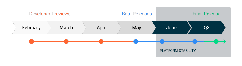 Il programma Developer Preview di Android 11, partito a febbraio 2020, ha una timeline pianificata fino alla versione pubblica finale per AOSP e OEM, prevista per il terzo trimestre 2020.