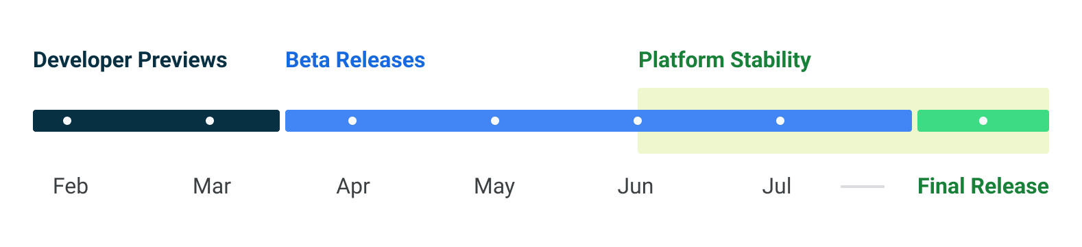 Per quanto riguarda la timeline, Google si aspetta di raggiungere la Platform Stability a giugno 2022, e da quel momento gli sviluppatori avranno diverse settimane prima del rilascio ufficiale, per i test finali.