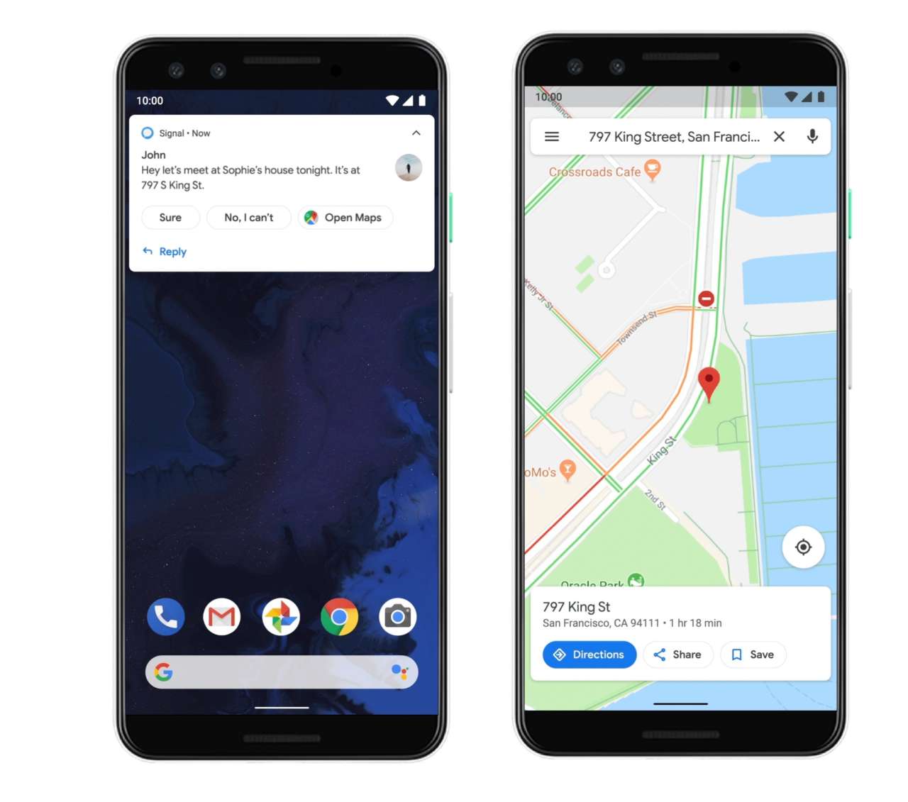 Android QIl machine learning on-device potenzia anche la funzione Smart Reply, ora integrata nel sistema di notifiche di Android. Ciò consente a qualsiasi app di messaggistica di suggerire risposte nelle notifiche. Smart Reply sarà anche in grado di prevedere in modo intelligente la prossima azione dell’utente. Ad esempio, se qualcuno invia un indirizzo, è possibile semplicemente un tocco per aprire quell’indirizzo in Maps.